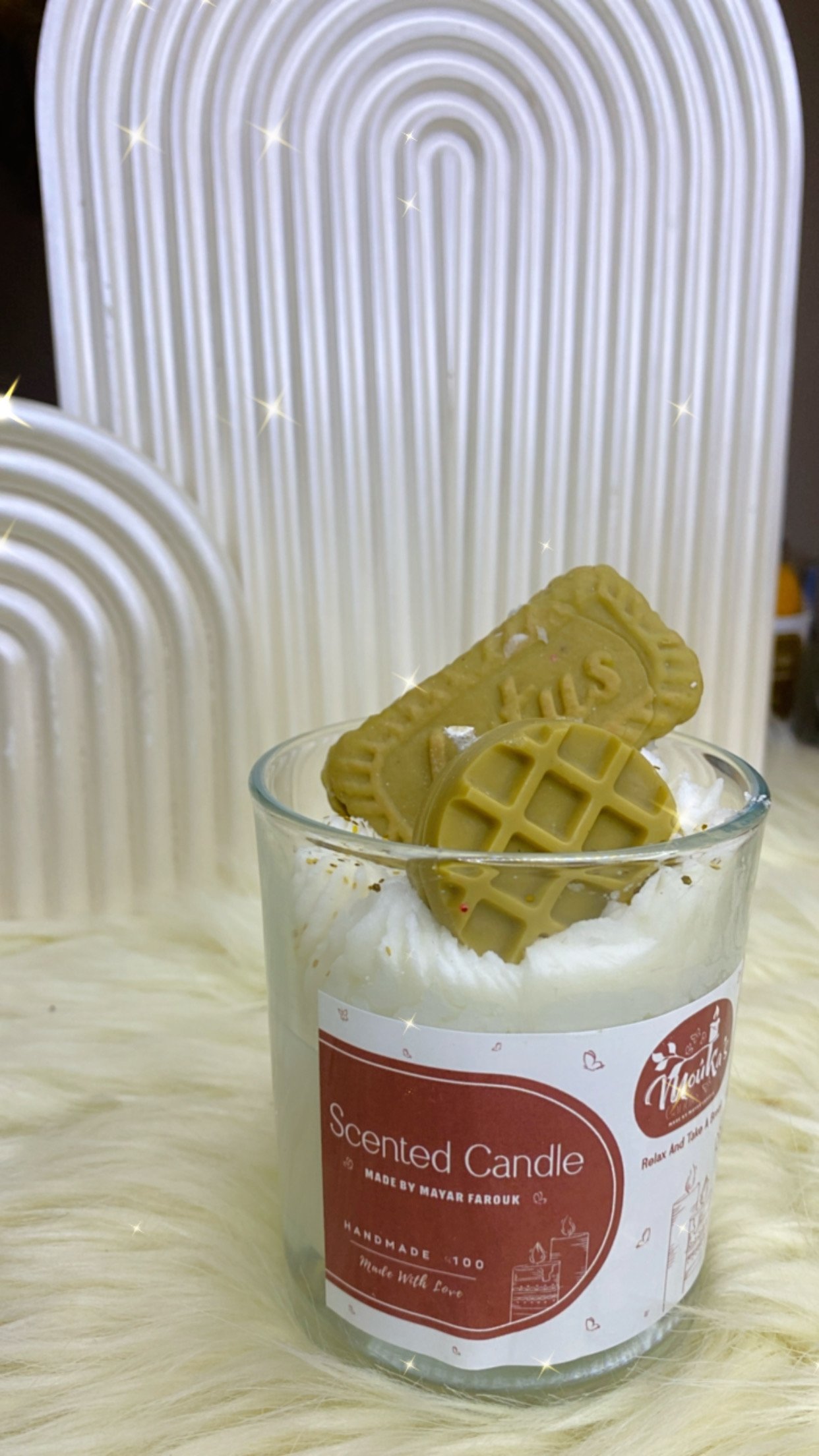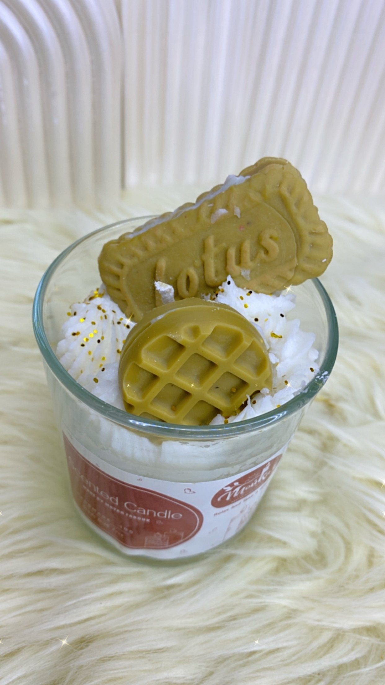 شمعة شكلها يفتح النفس… في جار شفاف يبين كل التفاصيل اللذيذة جواها: قطعة لوتس شكلها واقعي، ومعاها وافل كأنها خارجة من فرّان دافي. مزيج الحلاوة ده مع الشمع الكريمي بيعمل شكل مغري وناعم يخطف العين من أول لحظة.