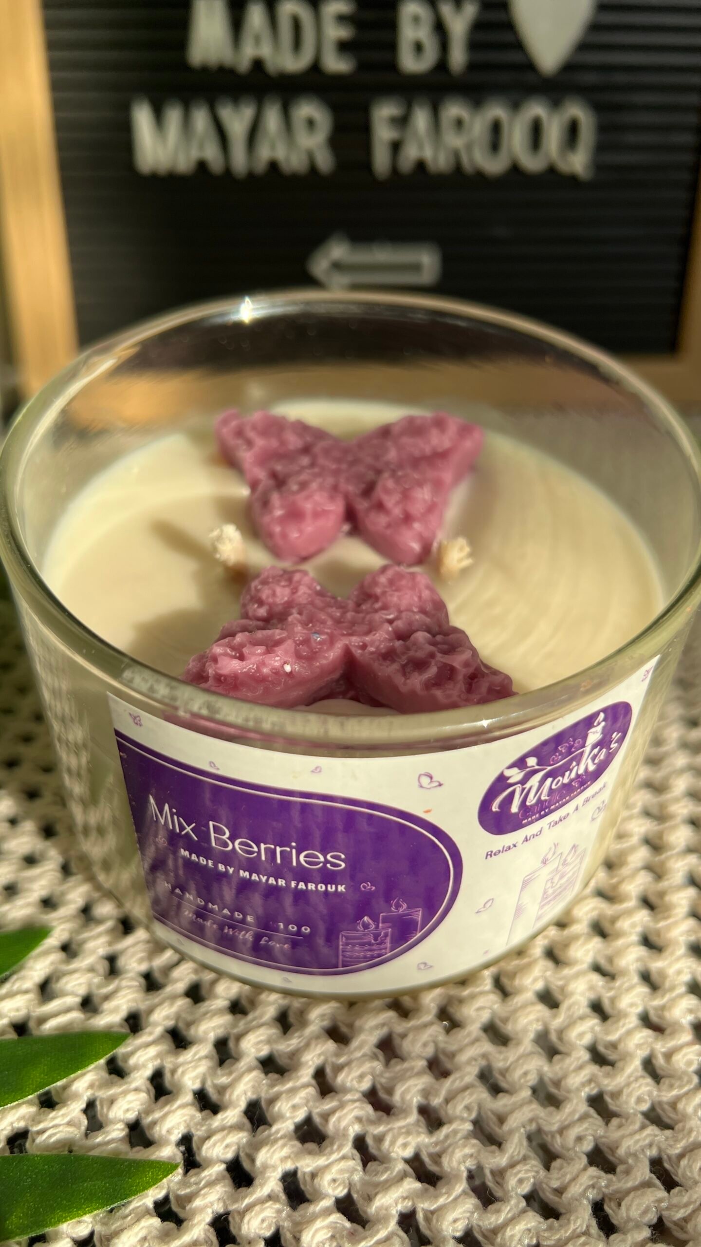 شمعة ناعمة في جار شفاف يبرز جمال الشمع الأبيض ورقة الفراشاتالمتناثرة فوقها. شكلها بسيط بس راقٍ جدًا، وكأنك قدام لوحة صغيرة من الهدوء والنقاء. التفاصيل الهادية الخفيفة بتديها لمسة “clean aesthetic” تخطف العين من أول لحظة.