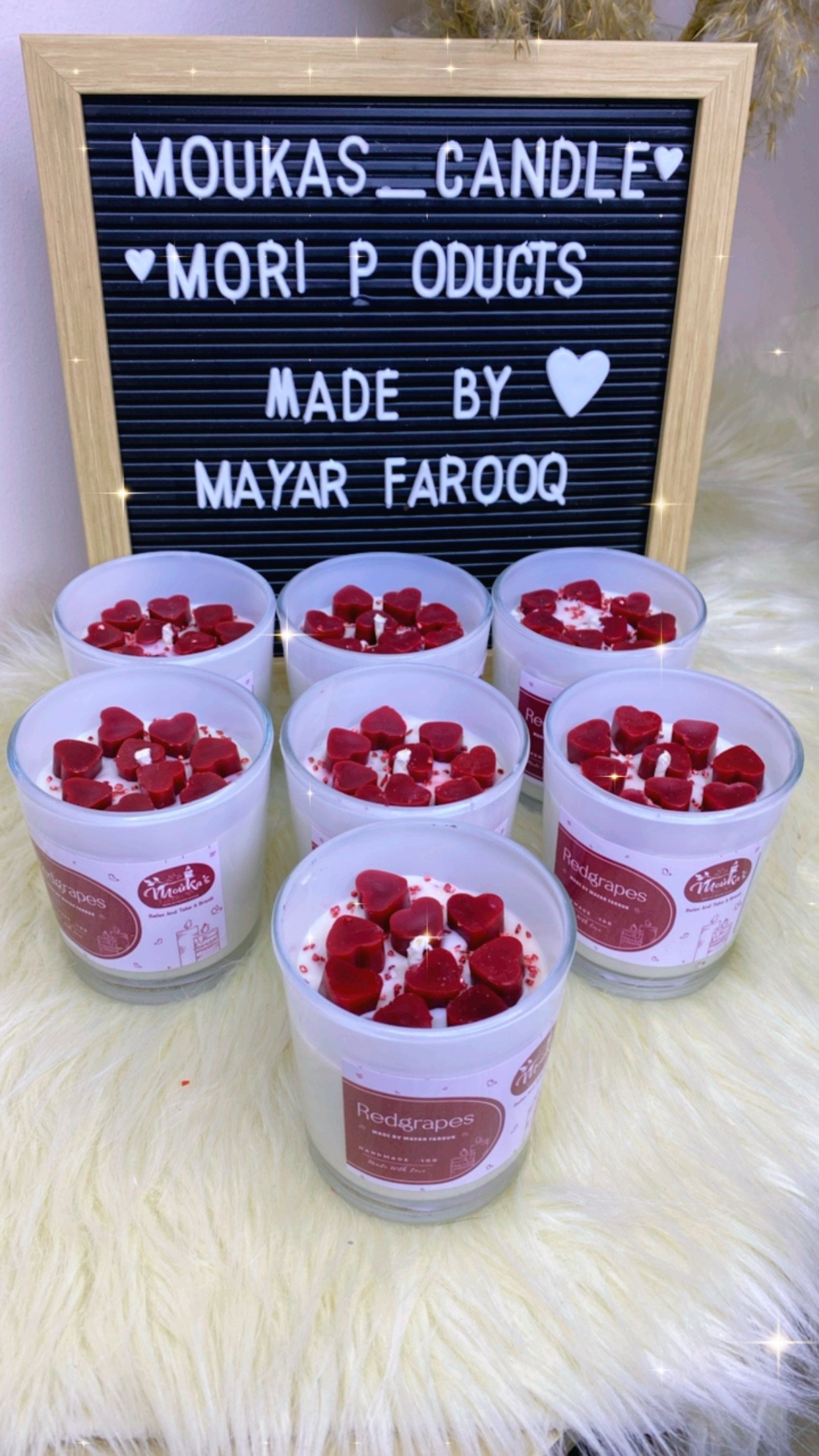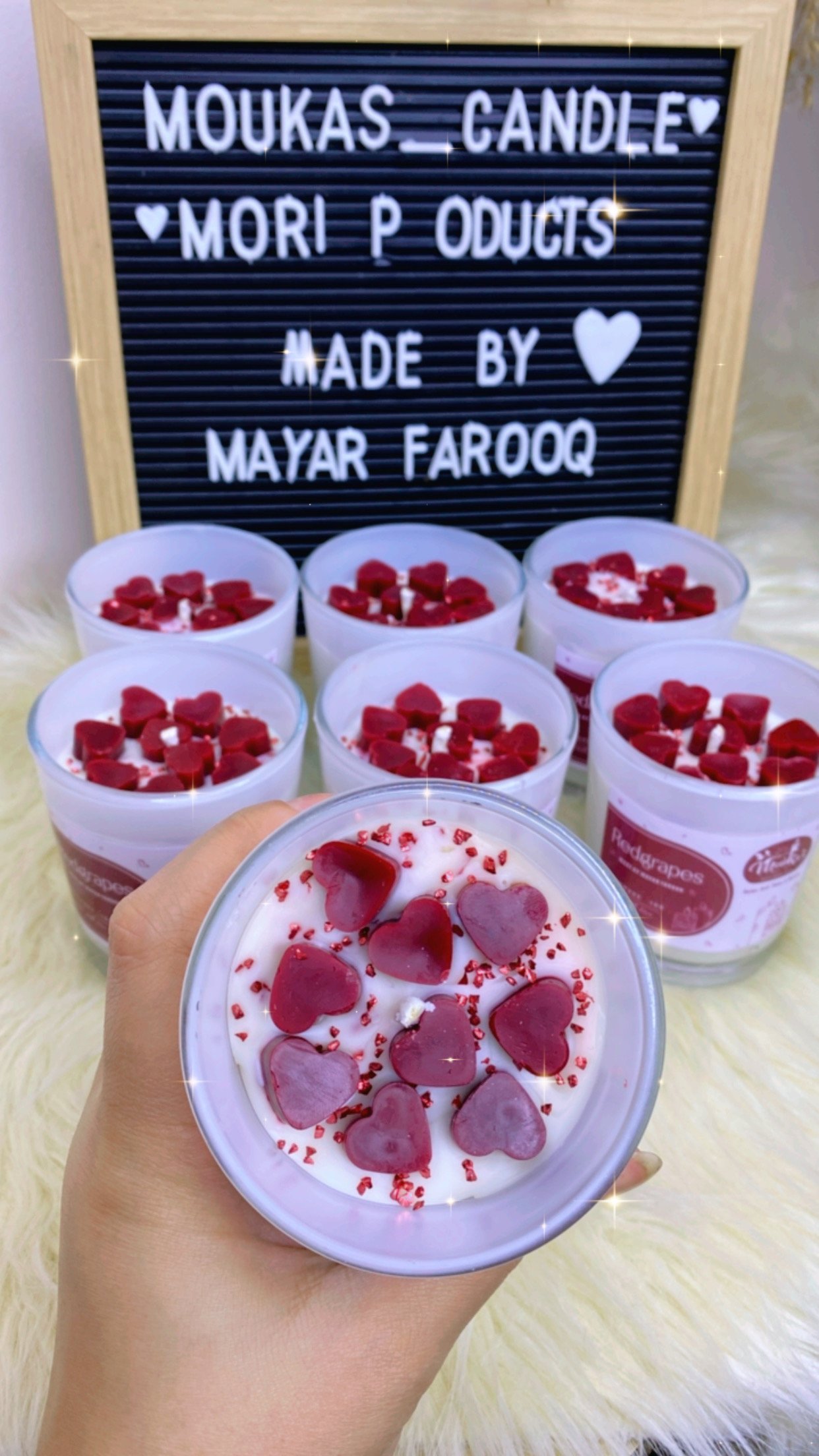شمعة راقية في جار أبيض ناعم، متزينة بديزاين قلوب حمرا لامعة، عاملة مزيج بين البساطة والرومانسية. الجار الأبيض بيعكس النور بطريقة هادية، ومع القلوب الحمرا بيخلق شكل دافئ يجذب العين ويغري أي ركن يتحط فيه.